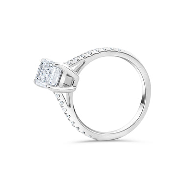 OROITALIA engagement ring in 14kt white gold, size US 7, with 1 EMERALD lab-created diamond, 2.04ct, F-color, VS clarity and 16 ROUND lab-cut diamonds, 0.23ct, E-F color, VS clarity, IGI certified.