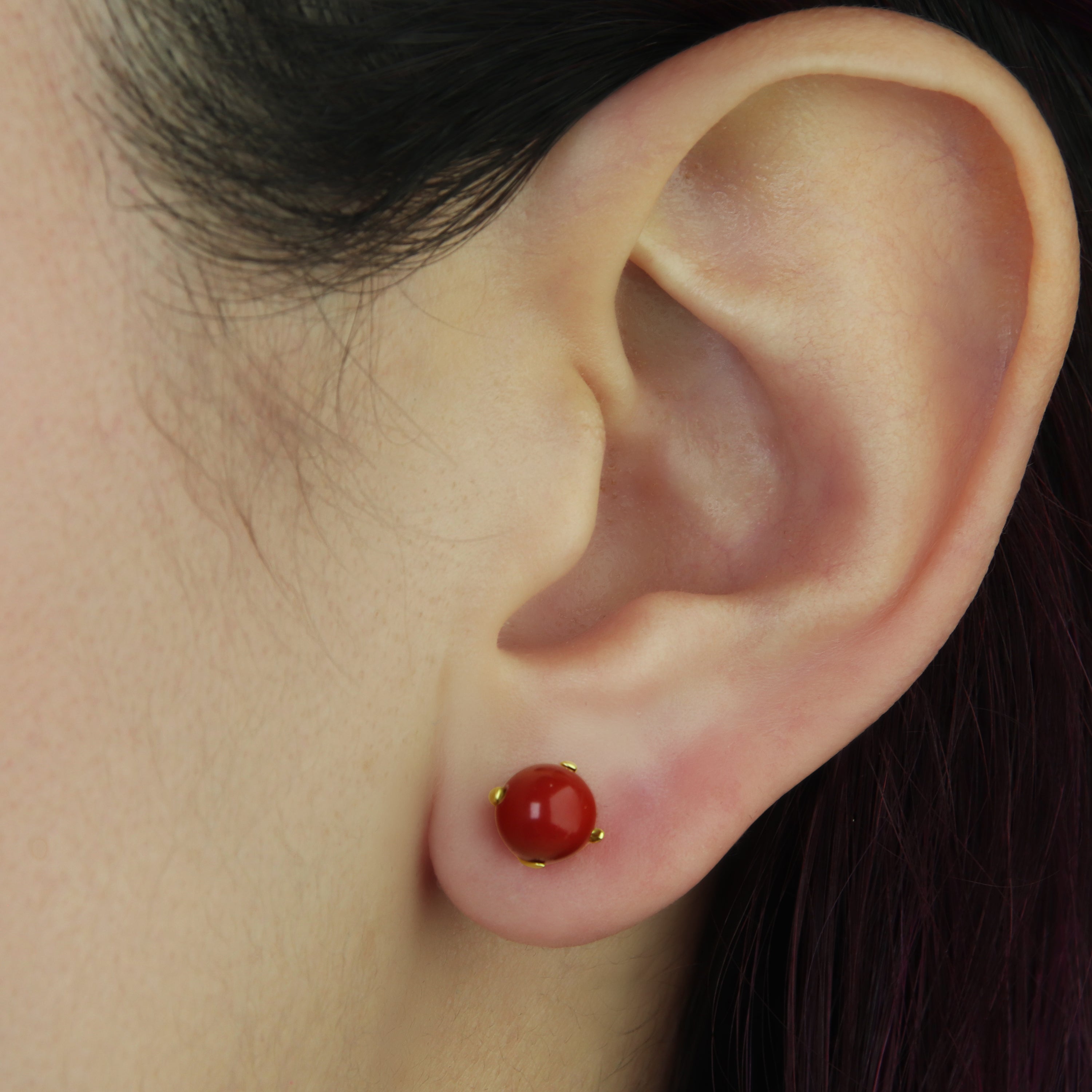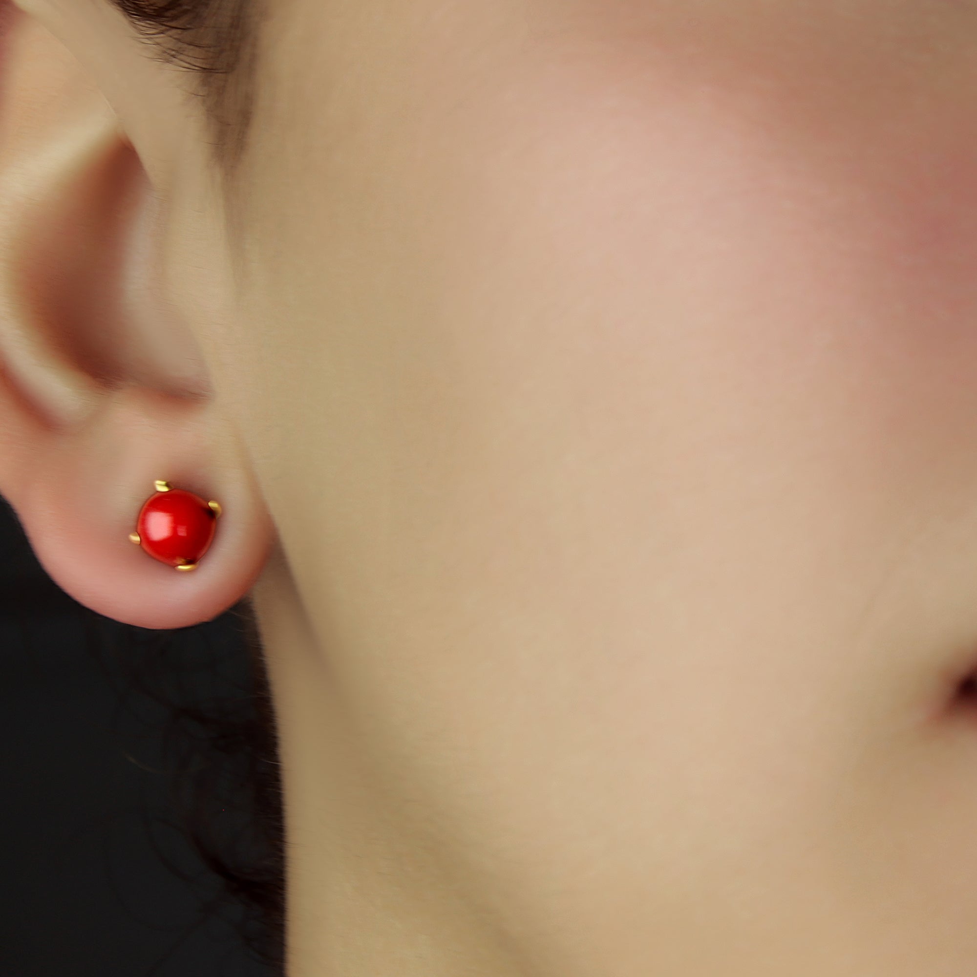 GIOVE MIO baby earrings in 18kt yellow gold, safety closure, with 2 corals ROUND cut, Red color.