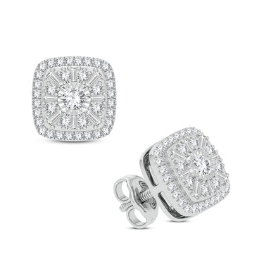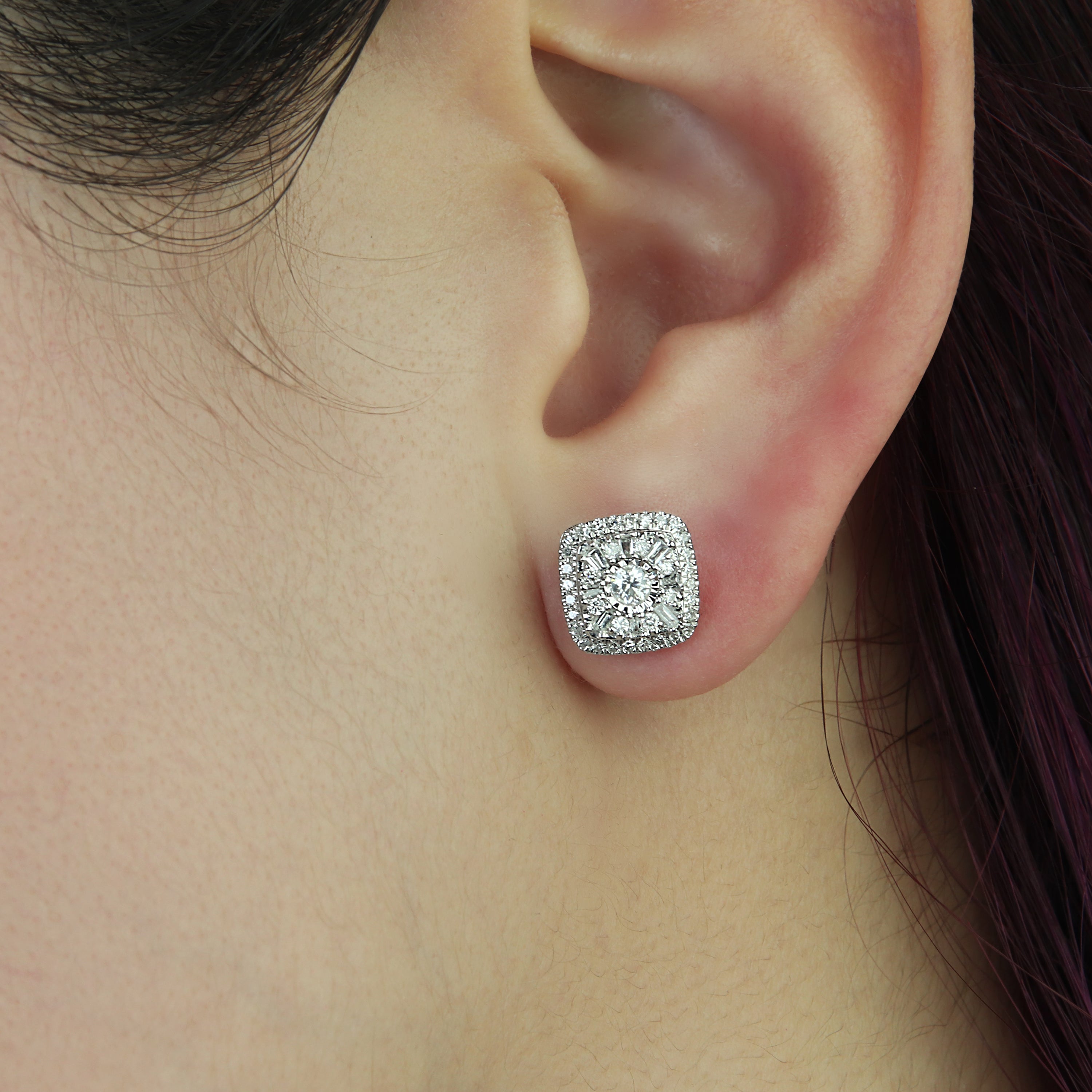 GIOVE MIO studs in 14kt white gold, screw closure, with 36 natural diamonds ROUND cut, 0.34ct, color H, clarity VS and 8 natural BAGUETTE cut diamonds, 0.16ct, color H, clarity VS.