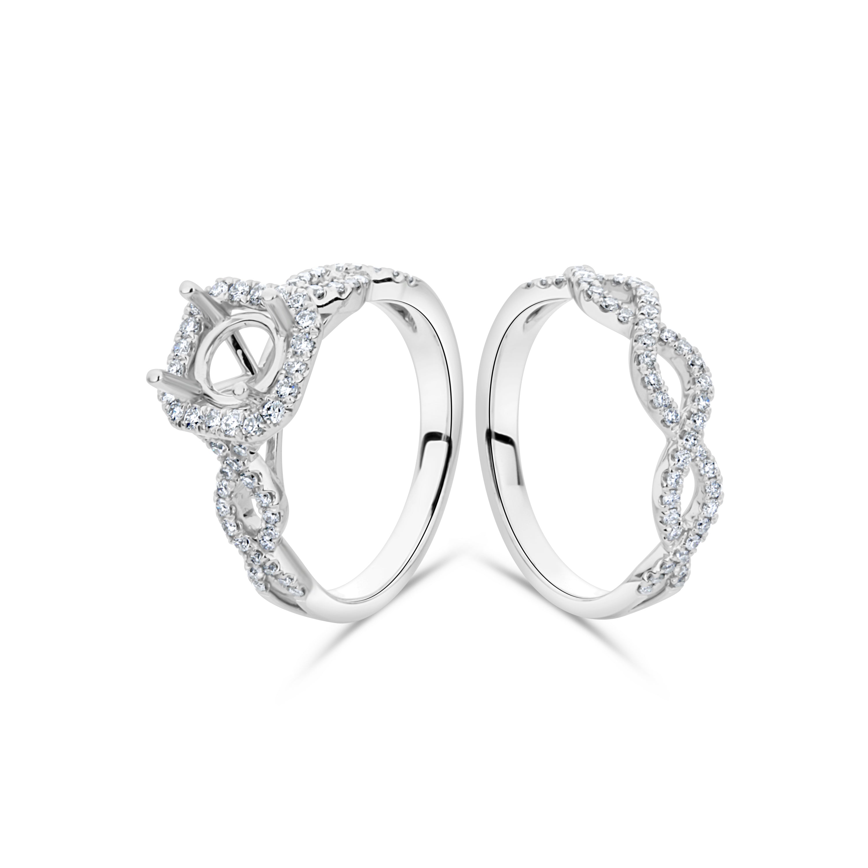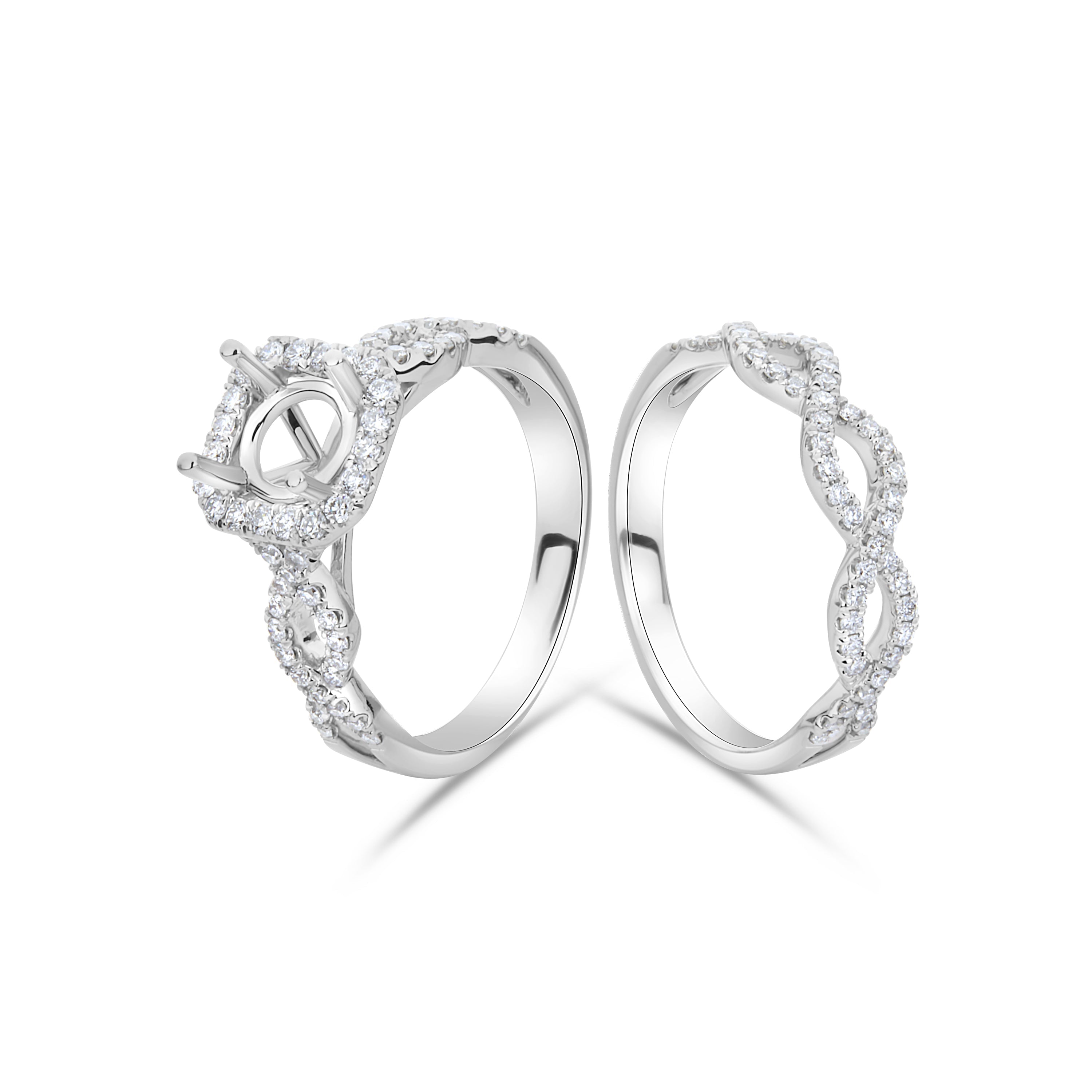 Celebrate love with this stunning 14kt white gold Engagement and Wedding Ring Set Setting showcasing 0.47ct natural diamonds. The centerpiece sparkles with 0.28ct diamonds, representing the start of your journey together. With intricate design and high-quality craftsmanship, this ring is a timeless symbol of eternal love. Make a statement with this elegant and sophisticated ring that will captivate her heart forever.