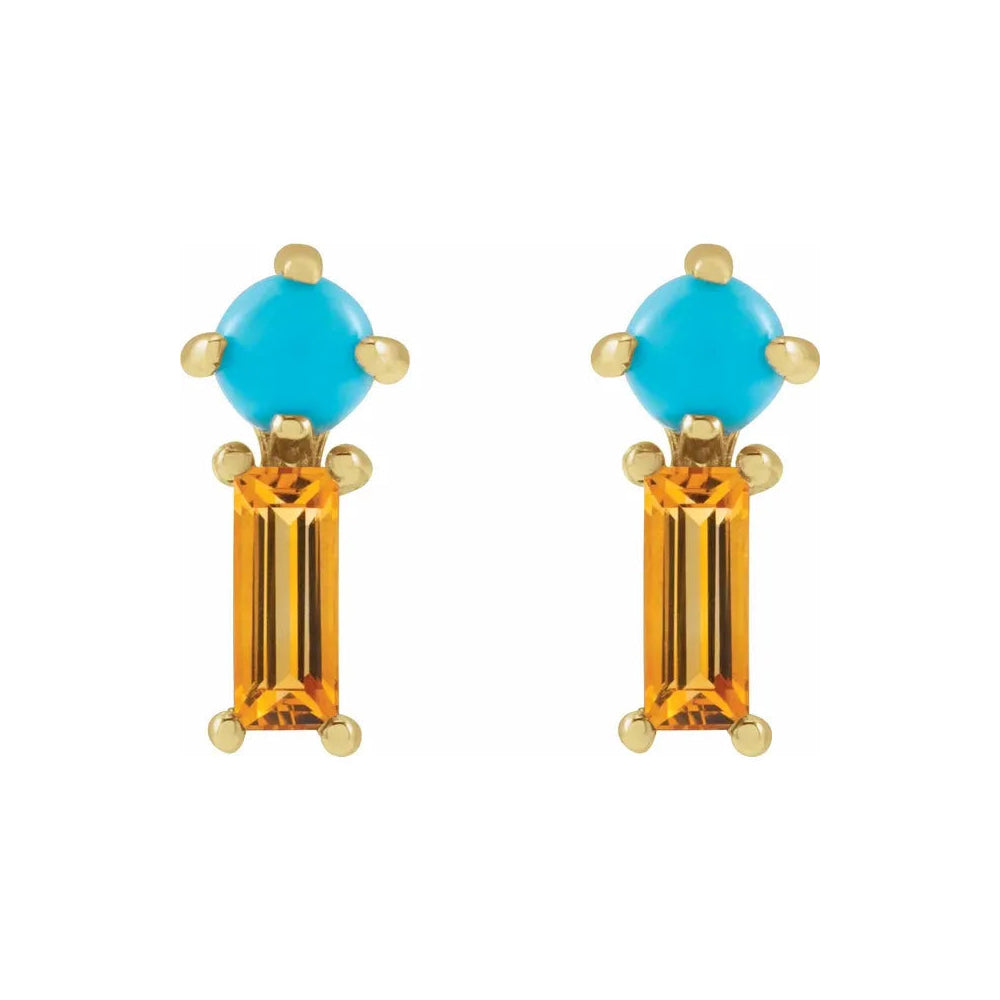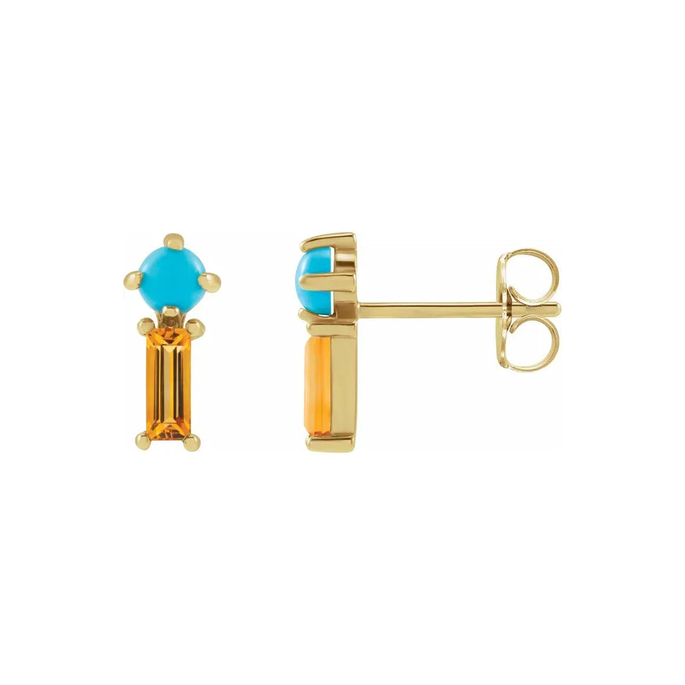 GIOVE MIO studs in 14kt yellow gold, butterfly clasp, with 2 BAGUETTE cut citrines and 2 ROUND cut turquoises.