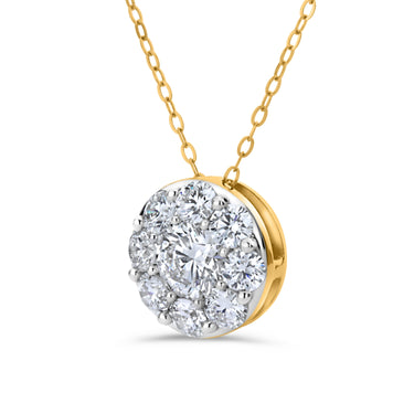 OROITALIA circular plural and circular pendant in 14kt yellow gold, with 1 ROUND cut laboratory created diamond, 0.91ct, G-H color, VS clarity and 8 ROUND cut laboratory created diamonds, 1.13ct, G-H color, VS clarity.